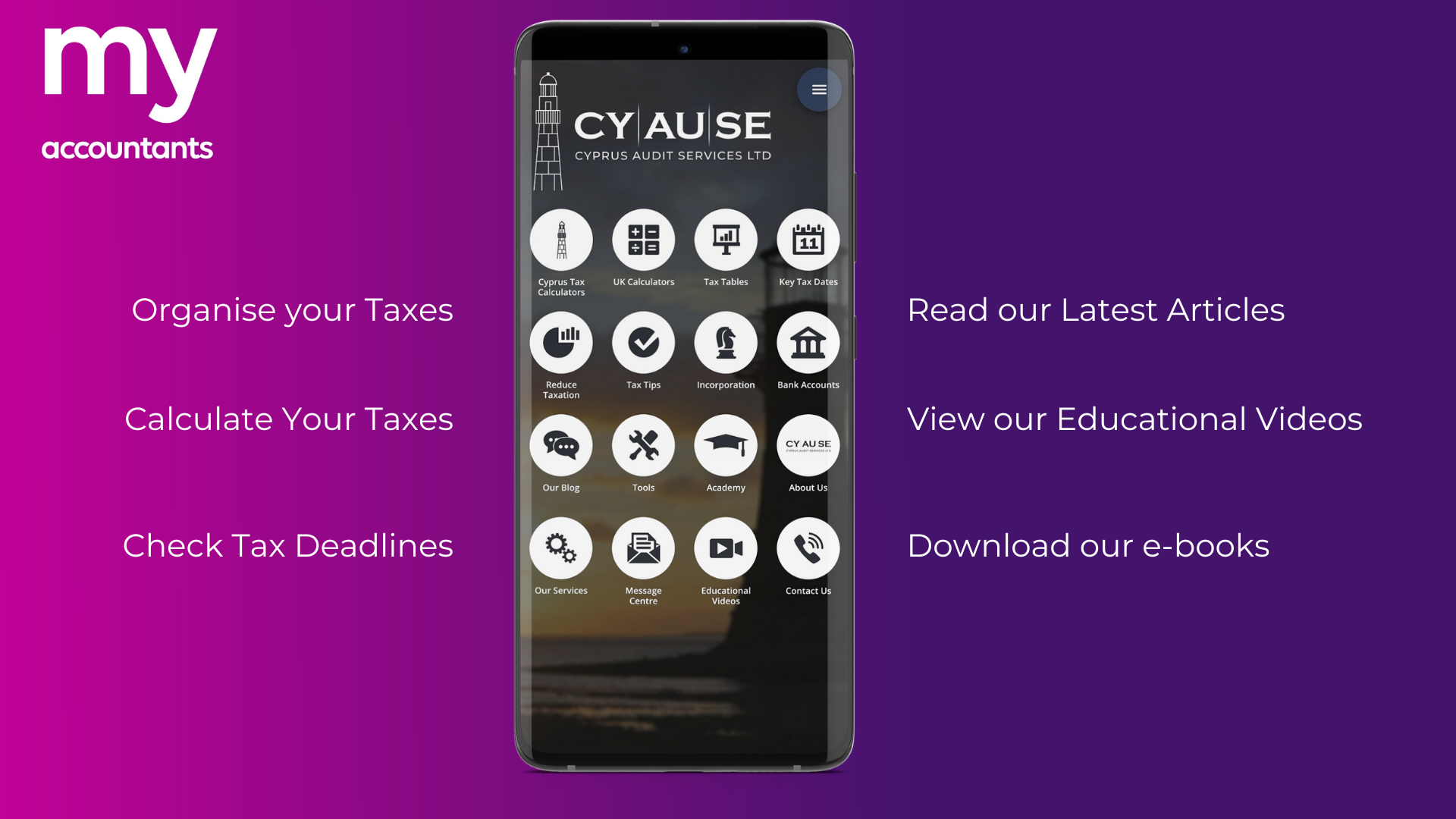 CYAUSE AUDIT SERVICES LTD is one of the very first accountancy practices in Nicosia, Cyprus, to launch a free mobile Tax App. The great news is that this App can be downloaded free on your iPhone, iPad or Android devices. It contains of some very useful Tax Tables, Calculators and important financial dates, all of which you will be able to access free of charge from anywhere you have an internet connection on your device.