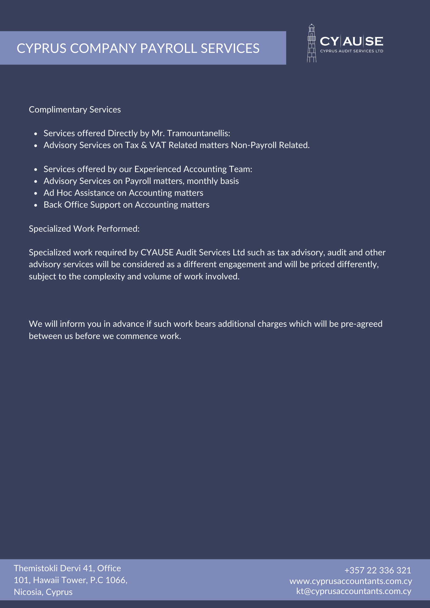 Specialized work required by CYAUSE Audit Services Ltd such as tax advisory, audit and other advisory services will be considered as a different engagement and will be priced differently, subject to the complexity and volume of work involved.